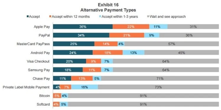 Laut einer Studie von Boston Retail Partners akzeptieren rund 36 Prozent aller US-Einzelhändler Apple Pay. PayPal findet lediglich in 34 Prozent der Befragten Akzeptanz. Zudem planen weitere 22 Prozent der Umfrageteilnehmer den Apple-Bezahldienst als Zahlungsvariante aufzunehmen.