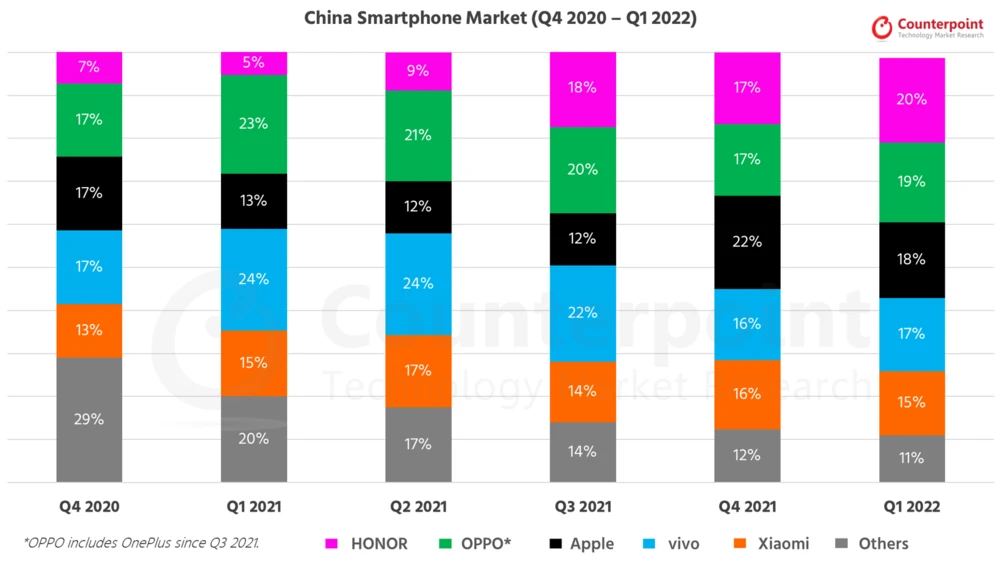 Apple könnte also überproportional vom chinesischen Wachstum profitieren, auch wenn es sich verlangsamt hat. Laut den Daten von Counterpoint Research kam Apple im ersten Quartal auf einen Marktanteil in China von 18 Prozent. Im Vorjahresquartal waren es nur 13 Prozent.