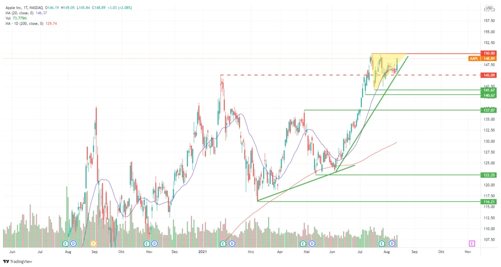 Durch den starken Anstieg bei der Apple-Aktie hellt sich das ohnehin bullishe Chartbild weiter auf. Die Kursbewegungen formten in den vergangenen vier Wochen ein sogenanntes steigendes Dreieck. Diese Chartformation wird in der Regel nach oben aufgelöst. Der Titel notiert nach dem gestrigen Anstieg nahe dem Allzeithoch bei 150 Dollar.