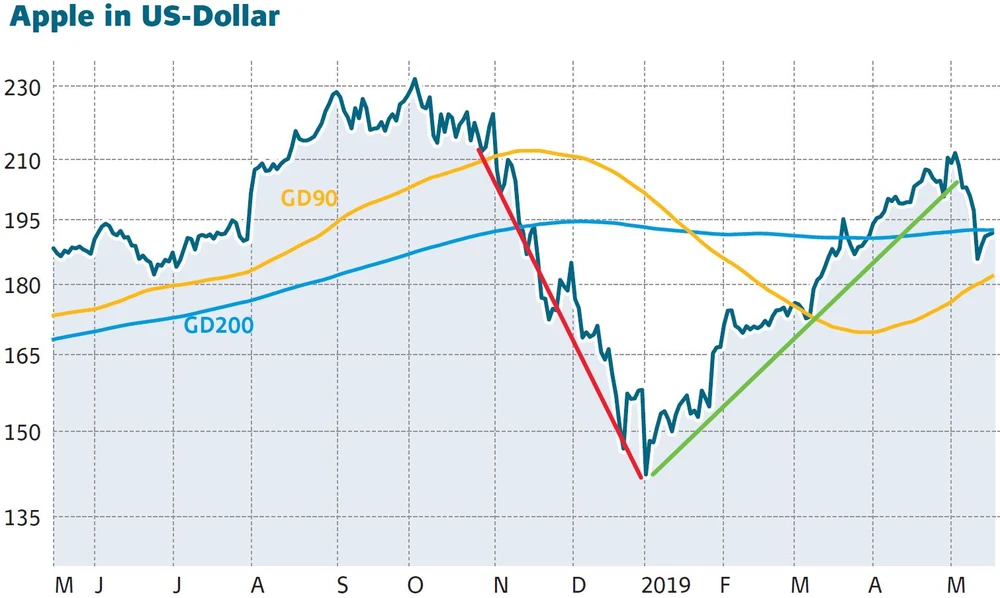 Gerade bei Qualitätstiteln wie Apple können sich Erholungen rasant vollziehen. Deutlich wurde das nach dem Einbruch, der im vergangenen Herbst begann und sich bis zum Jahreswechsel fortsetzte. Damals fiel die Aktie bis auf 141 Dollar. Anschließend kam es bis Mai zu einer ähnlich rasanten Erholung. Es bildete sich eine nahezu v-förmige Formation aus.
