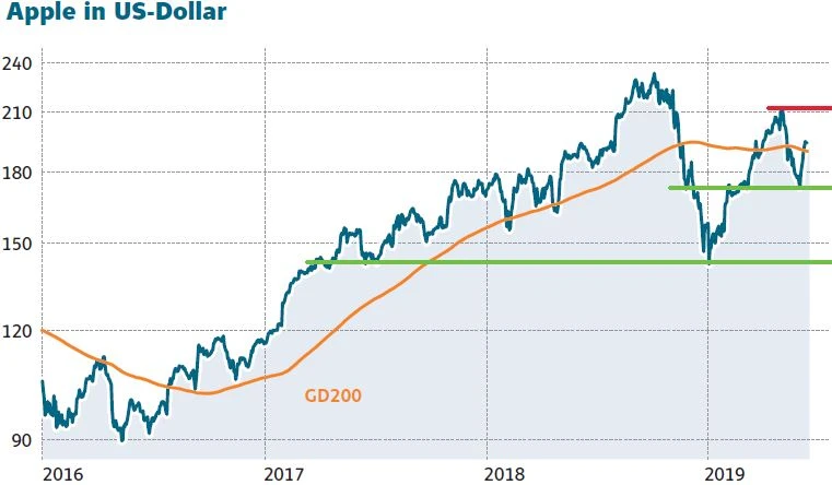 Die Aktie von Apple hat im Mai eine deutliche Korrektur vollzogen. Mehr als 20 Prozent hat der Kurs zwischenzeitlich eingebüßt. Einen Großteil der Verluste hat Apple allerdings bereits wieder aufgeholt. Dabei gelang es auch, die wichtige 200-Tage-Linie zurückzuerobern, was ein klares positives Signal bedeutet. Nun gilt es jedoch auch, dieses positive Signal zu verteidigen. Die nächste große Hürde wäre das Jahreshoch, das Anfang Mai bei 215,31 Dollar markiert wurde. Das Allzeithoch wartet bei 233,47 Dollar. Dieses wurde Anfang Oktober vergangenen Jahres erreicht.