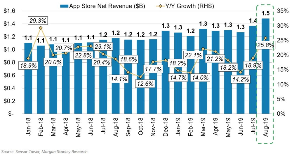 Laut Sensor Tower seien Apples Umsätze im August auf rund 1,5 Milliarden Dollar gestiegen, ein Plus von 25,8 Prozent gegenüber dem Vorjahr und damit deutlich stärker als von Morgan Stanley erwartet. Das Wachstum gegenüber dem August fiel dabei so hoch aus wie zuletzt 2015.