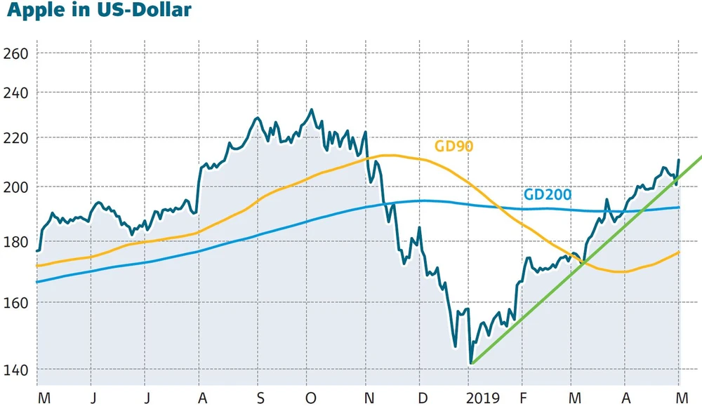 Nach starken Q2-Zahlen klettert die Apple-Aktie wieder in Richtung Allzeithoch. Noch fehlen zwar knapp 11 Prozent auf das Rekordhoch bei 233,47 Dollar. Doch DER AKTIONÄR rechnet unverändert damit, dass dieses bald erreicht werden kann. Besonders das Services-Geschäft könnte sich 2019 zum Hingucker entwickeln. Kursziel des AKTIONÄR: 230 Euro.