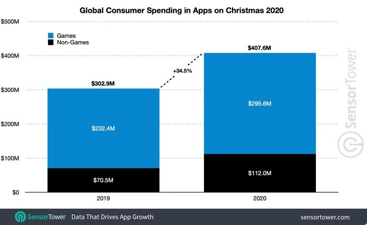 Laut Daten von Sensor Tower wurden in Apples App Store und auf Googles Play Store allein an Weihnachten rund 408 Millionen Dollar an digitalen Waren umgesetzt. Gegenüber dem Vorjahr entspricht dies einem Zuwachs von satten 35 Prozent.