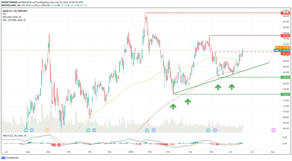 In den letzten zwei Monate testete die Aktie mehrfach die Unterstützung am GD200. Anleger konnten sich auf seine stützende Wirkung verlassen. Zum Monatswechsel in den Juni startete die Aktie dann einen neuen Ausbruchsversuch ausgehend von 124 Dollar. Der Kurs erreichte in zwei Wochen den aktuellen Widerstand bei 131 Dollar.
