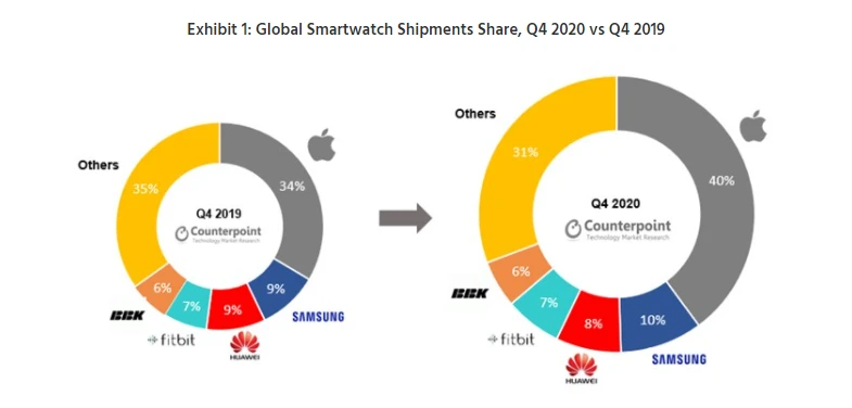 Laut den Marktforschern hat Apple alleine im Weihnachtsquartal 12,9 Millionen Apple Watches verkauft und den Marktanteil im Vergleich zum Vorjahreszeitraum um sechs Prozentpunkte auf satte 40 Prozent gesteigert. Das ist umso beachtlicher, wenn man bedenkt, dass die globalen Verkäufe von Smartwatches im vierten Quartal insgesamt sogar leicht rückläufig waren.
