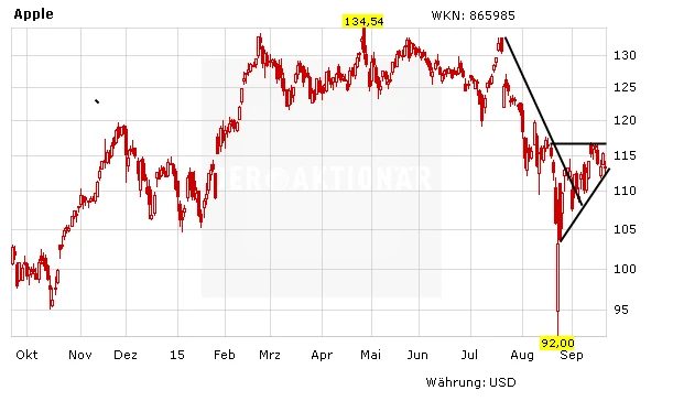 Seit dem Flash-Crash am 24. August ist bei der Apple-Aktie ein Aufwärtsimpuls intakt. Vom Tief bei 92 Dollar hat das Papier schon wieder 21,40 Dollar aufgeholt. Die wichtigste Jahreszeit steht für den Konzern aus Cupertino noch an: In 92 Tagen dürften weltweit wieder iPhones unter dem Weihnachtsbaum liegen. Dann dürfte die Aktie auch wieder deutlich höhere Kurse aufweisen – zumindest nach Ansicht der US-Investmentbank Goldman Sachs.