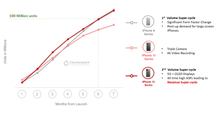 Die Nachfrage nach dem iPhone 12 entwickelt sich damit nahezu deckungsgleich mit der des iPhone 6 im Jahr 2014 – was die Assoziation zum damaligen „Superzyklus“ verstärkt. Mit dem iPhone 6 hatte bei Apple das 4G-Zeitalter begonnen, das iPhone 12 ist das erste Modell, das den aktuellen 5G-Mobilfunkstandad unterstützt.