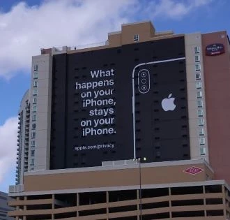 Wie unterschiedliche US-Medien berichten, prangt von einer Hausfassade in Richtung Messegelände eine überdimensionale Botschaft von Apple: "What happens on your iPhone, stays on your iPhone". Übersetzt und im Klartext: Was Sie auf Ihrem iPhone anstellen, bleibt Ihre Privatangelegenheit und geht niemanden etwas an.
