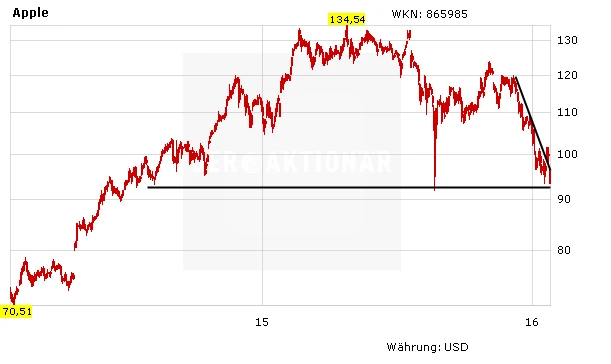 Für den Giganten Apple lief es schon einmal besser. Der Aktienkurs notiert - ausgenommen den Flash-Crash vom September - auf einem 17-Monats-Tief. Nur im chinesischen Markt wuchsen die Umsätze deutlich. Im Vergleich zum Vorjahresquartal stiegen dort die Erlöse um 14 Prozent. Allerdings ist der Zuwachs im Vergleich zu vergangenen Quartalen eher gering. Dieser Trend dürfte sich aufgrund der rückläufigen Wirtschaftsaktivität im Reich der Mitte weiter fortsetzen. Neuanleger halten sich trotz einer günstigen Bewertung (KGV von 10) zurück.