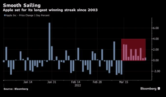 In diesem Fall würde die Gewinnserie auf elf Handelstage wachsen. Nach Bloomberg-Informationen gab es das bei Apple zuletzt im Jahr 2003 – als das iPhone noch nicht einmal erfunden und Nokia die globale Nummer 1 unter den Mobiltelefonherstellern war.
