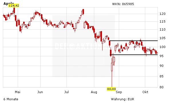 Um der Apple-Aktie neuen Schwung zu verleihen, reicht diese Neuigkeit nicht. Der Titel bewegt sich seit Wochen seitwärts. Für neue Impulse könnten die Quartalszahlen sorgen, die am 27. Oktober veröffentlicht werden. Die Experten rechnen im Durchschnitt mit einem Umsatzwachstum von 20 Prozent auf 51 Milliarden Dollar. Neuanleger warten charttechnische Signale ab.