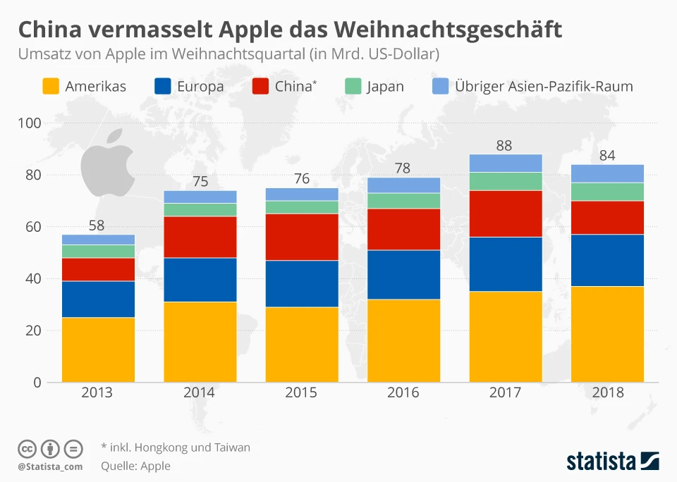 Trotz des deutlichen Rückgangs in den vergangenen Jahren bleibt China für Apple ein wichtiger Absatzmarkt. Ein Wiederaufflammen des Handelskonflikts könnte das China-Geschäft jetzt weiter schwächen.