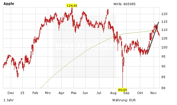 Könnte Apple tatsächlich die Verkäufe des Umsatztreibers iPhone weiter steigern, würde sich das stark auf die finanzielle Situation Apples auswirken. Sollten die Kalifornier die Rekordzahl von 74,5 Millionen verkauften iPhone überbieten können, würde der Anteil der iPhones am Gesamtumsatz sogar noch weiter steigen. Die Umsatzprognose des nächsten Quartals liegt bei 77 Milliarden Dollar. Investierte Anleger bleiben dabei. Der Stoppkurs sollte bei 91,50 Euro gesetzt werden. Der Aufbau von neuen Positionen empfiehlt sich aufgrund des angespannten Chartbildes momentan nicht.