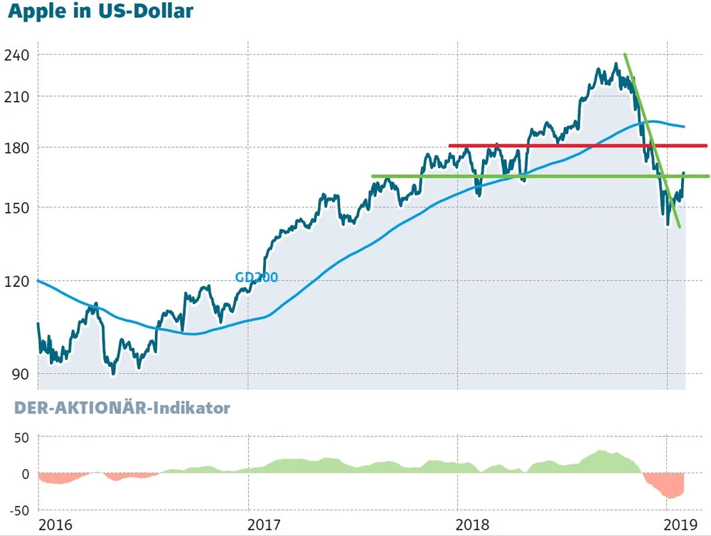 Die Apple-Aktie arbeitet sich langsam nach oben. Die aktuelle Bewertung lässt weiter Spielraum nach oben. mit einem 2020er-KGV von 12 ist der Wert günstig . Die Aktie bleibt nach Ansicht des AKTIONÄR daher weiterhin ein Kauf.