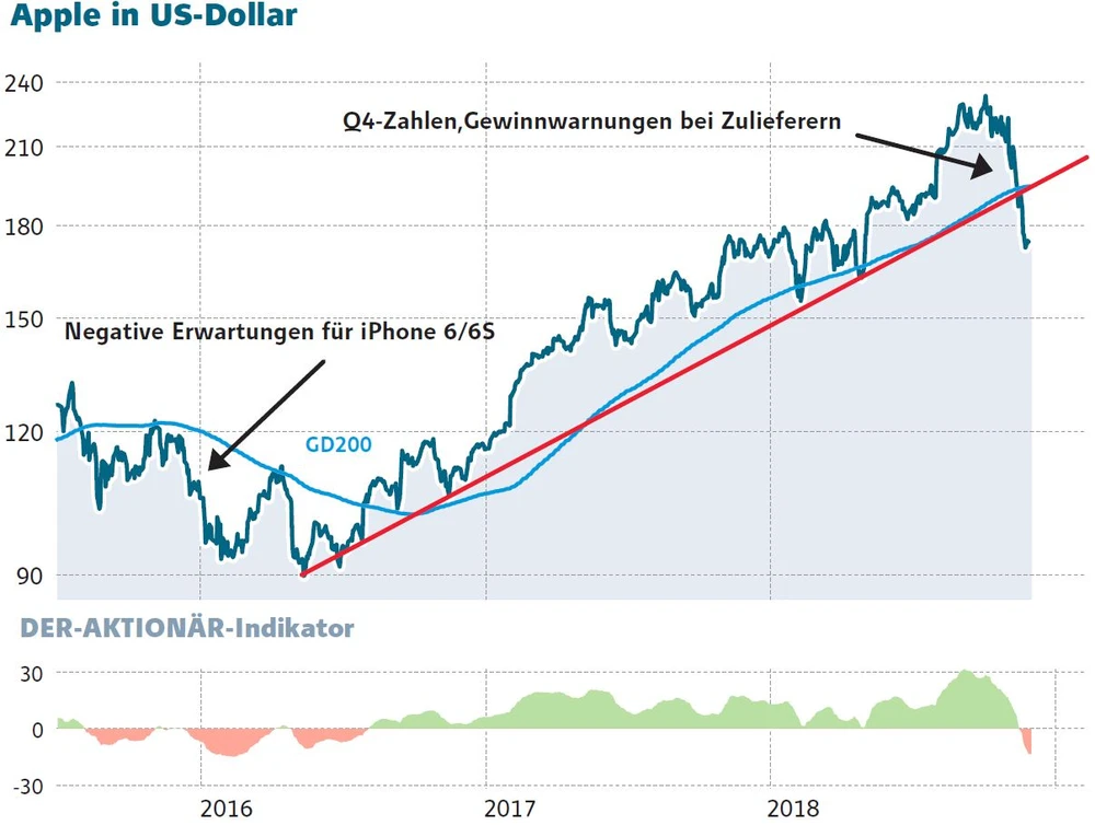 Wenn man sich den Apple-Kurs ansieht, könnte man auf die Idee kommen, dass das Weihnachtsgeschäft mit iPhones gelaufen sei. Die Aktie hat von ihrem Hoch rund ein Viertel an Wert verloren, Apple musste den Titel „Wertvollste Firma der Welt“ an Microsoft abgeben.