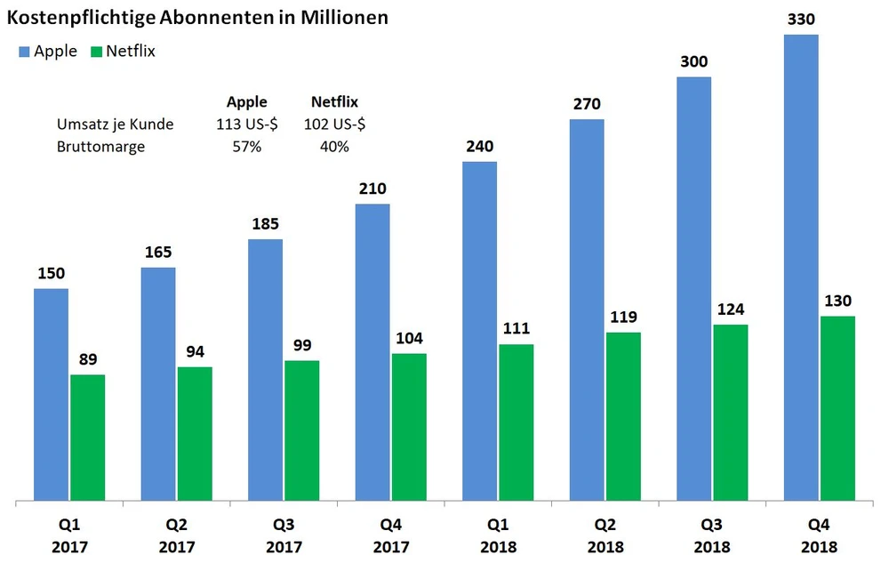 Grund für diese zuversichtlichen Annahmen ist die – trotz zuletzt stagnierender Verkäufe - wachsende Gerätebasis. Aktuell zählt die installierte Basis 1,3 Milliarden Apple-Geräte. In den nächsten drei bis vier Jahren wird diese Zahl auf 1,5 Milliarden Geräte anwachsen. Gleichzeitig hat Apple bereits einen respektable Kundenbasis von 650 bis 700 Millionen Kunden, deren Kreditkartendaten bereits bei Apple hinterlegt sind. Diese Kunden dürfte Apple mit seinem Service-Angebot künftig vornehmlich bearbeiten. Ohnehin hat der Konzern bereits der Konkurrenz in Sachen Abo-Anzahl den Rang abgelaufen. Apple verfügt aktuell über 330 Millionen zahlende Abonnenten über das komplette Ökosystem hinweg. Zum Vergleich: Netflix hat aktuell rund 130 Millionen zahlende Abonnenten. Mit dem TV-Angebot und Apple Music, das in den USA bereits mehr Abonnenten hat als Branchenführer Spotify, dürfte Apple in den nächsten Jahren weiter am Wachstum seiner Abonnentenbasis arbeiten.