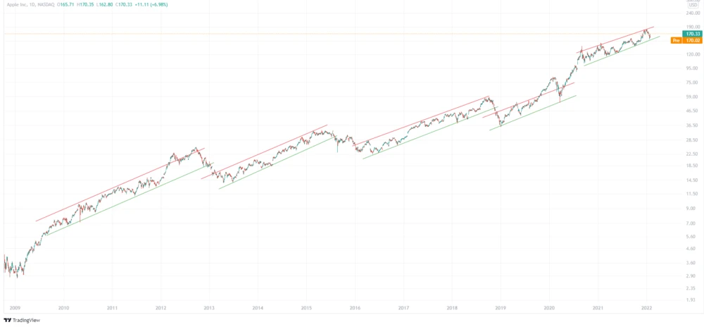 Scharfe Korrekturen sind für Apple keine Seltenheit. 2008 rauschte der Kurs 60 Prozent nach unten, Ende 2018 verlor er 40 Prozent und im Corona-Crash 35 Prozent an Wert. Auch abseits von Krisen konsolidierte die Aktie immer wieder stark. So halbierte sich der Kurs 2012 beinahe. Dagegen erscheint die aktuelle Korrektur um 16 Prozent fast harmlos.