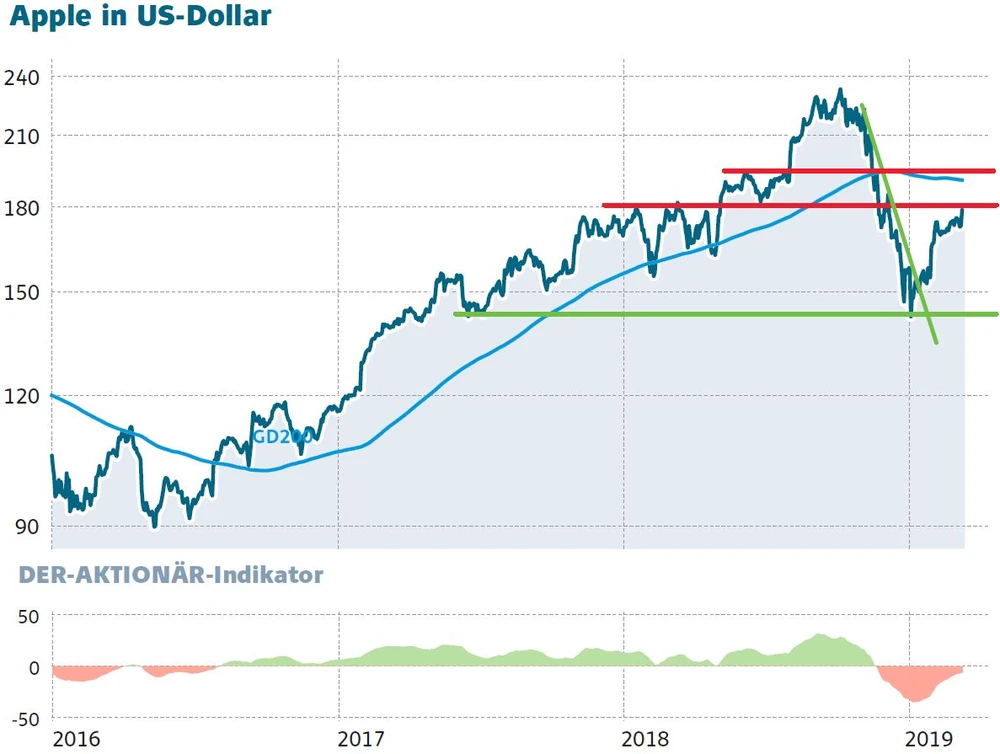 Im kürzlich abgelaufenen Jahr machte das Servicegeschäft mit 37 Milliarden Dollar 14 Prozent der Umsätze aus. Bis 2022 dürfte der Anteil schon bei 25 Prozent und 86 Milliarden Dollar liegen. Aufgrund der hohen Bruttomarge von rund 60 Prozent wird der Serviceanteil am Bruttogewinn Richtung 40 Prozent tendieren. Das Apple-Ökosystem bietet im Servicegeschäft riesige Potenziale, die Apple nutzen will. Die Tatsache, dass man künftig keine Geräteabsätze mehr veröffentlichen wird, dokumentiert auch das Selbstverständnis, dass Apple künftig als Service- und Abo-Business wahrgenommen werden will. Derartige Geschäftsmodelle werden an der Wall Street mit Bewertungsprämien versehen. Entsprechend haben sich auch erste Analysten hervorgewagt, die 80 Prozent des Apple-Kurses durch das Service-Business abgedeckt sehen.