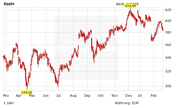 Nach der deutlichen Aufholjagd der Apple-Aktie seit ihren Tiefpunkten im Bereich von knapp 400 Dollar im vergangenen Jahr ist der Wert vor einigen Wochen bis auf 575 Dollar vorgestoßen. Seitdem ist die Aktie aber in einen Konsolidierungskurs übergegangen, die insbesondere psychologisch wichtige Marke von 500 Dollar konnte aber verteidigt werden. In den kommenden Wochen könnte Apple erneut Auftrieb erfahren. Unterstützung könnte das Papier von den sich verdichtenden Gerüchten um die iWatch und eventuell weiteren neuen Produkten erhalten. Mit einem Stopp bei 335 Euro investiert bleiben.