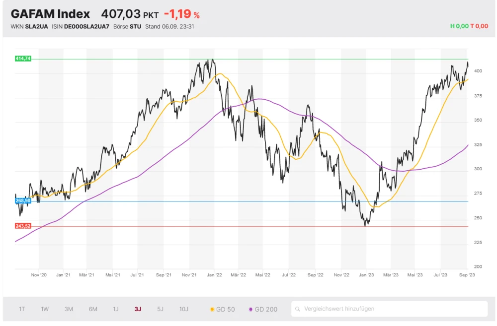Apple, Microsoft, Meta, Alphabet und Amazon sind Mitglieder des sehr erfolgreichen GAFAM Index. Anstatt auf eine Einzelaktie zu setzen, haben Anleger mit dem Indexzertifikat WKN DA0AB2 die Möglichkeit an der Entwicklung der fünf Technologieunternehmen gleichzeitig zu partizipieren.