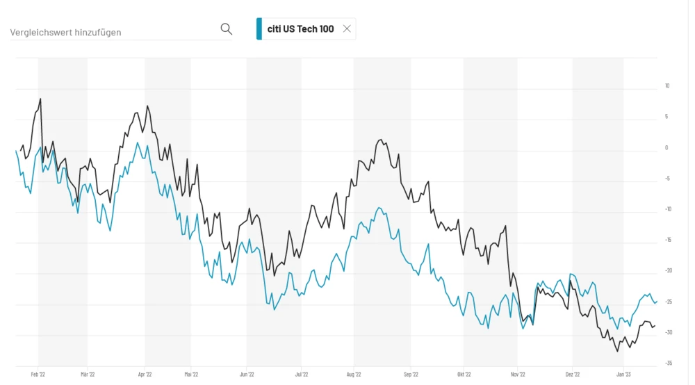 2022 hat der breit aufgestellte Nasdaq 100 rund 32 Prozent verloren. Noch etwas schlechter erging es dabei den großen Tech-Werten Apple, Amazon, Meta, Alphabet und Microsoft. Alle fünf Titel sind Indexmitglieder im GAFAM Index. Dieser verlor im gleichen Zeitraum fast 40 Prozent.
