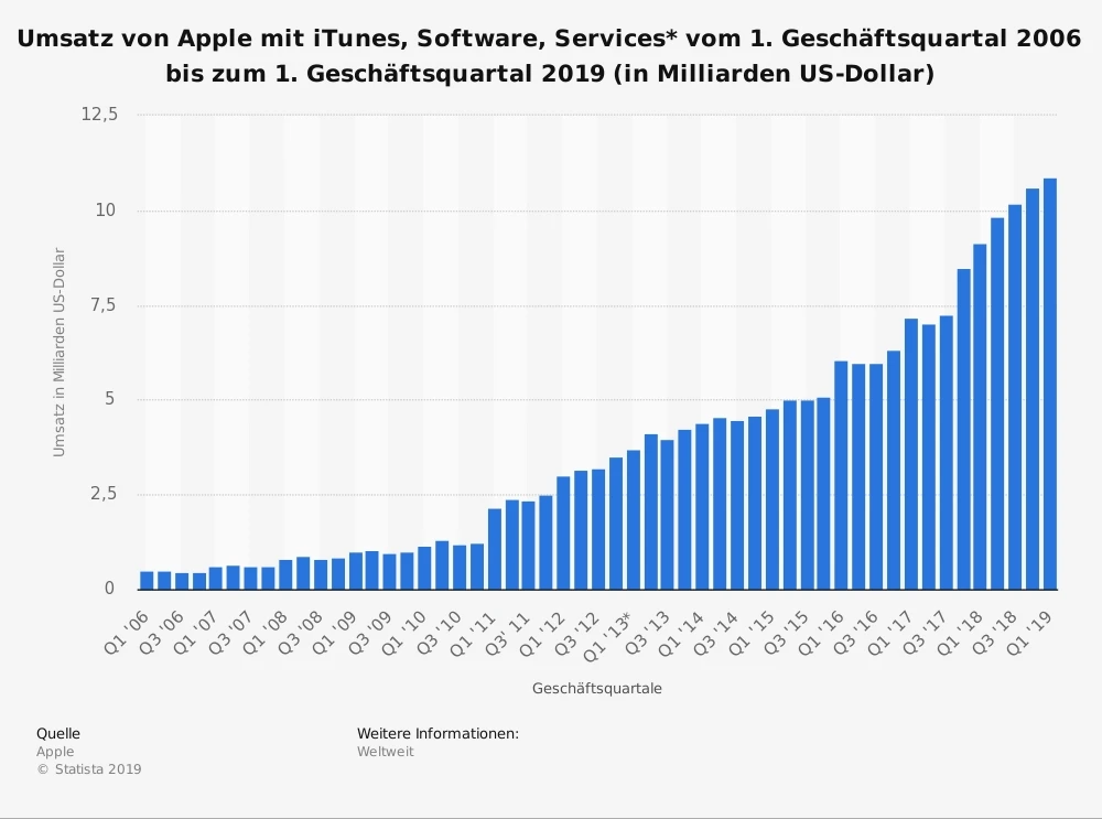 Dass dieser Weg erfolgsversprechend ist, zeigt sich in den steigenden Umsätzen des iTunes, Software und Services-Geschäfts. Im ersten Quartal 2019 steig der Serivces-Umsatz gegenüber dem Vorjahresquartal um 19 Prozent auf 10,88 Milliarden Dollar.