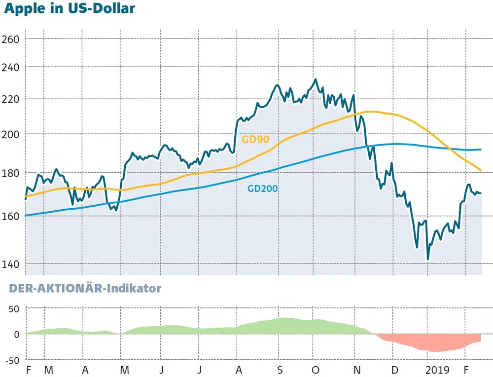 Die Apple-Aktie arbeitet sich langsam nach oben. Noch notiert das Papier zwar deutlich unter der 90-Tage-Linie bie 181 Dollar und der 200-Tage-Linie bei 192 Dollar. Die aktuelle Bewertung lässt jedoch unverändert Spielraum für ein Weiterlaufen des Aufwärtstrends. Denn mit einem 2020er-KGV von 12 bleibt der Wert günstig. DER AKTIONÄR sagt unverändert: Kaufen!