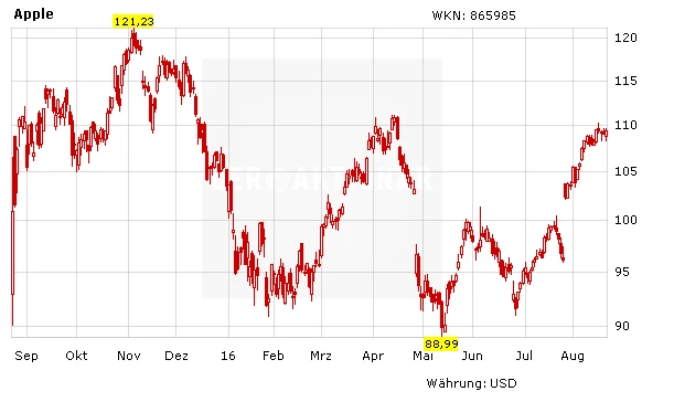 Schon jetzt auf den Erfolg des Apple Cars zu setzen, ist bei den vorhandenen Informationen zu früh. Charttechnisch wurde mit dem Sprung über die 200-Tage-Linie aber ein Kaufsignal generiert. Nach der rapiden Aufwärtsbewegung, ausgelöst durch die Quartalszahlen, hält sich die Aktie nun knapp über 109 Dollar. Anleger sollten deshalb ihre Gewinne laufen lassen.