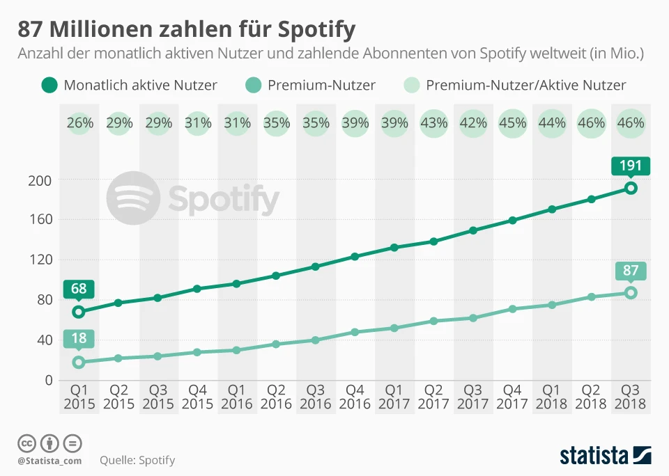 Wie aus den kürzlich veröffentlichten Q3-Zahlen hervorgeht, hat Spotify die Zahl der Premium-Kunden zuletzt weiter steigern können, auf nun 87 Millionen Nutzer. im Vergleich zum Vorjahreszeitraum ist die Zahl der Premium-Abonnenten mit 40 Prozent damit doppelt so stark gewachsen wie die Zahl der Nutzer des kostenlosen, werbefinanzierten Angebots.