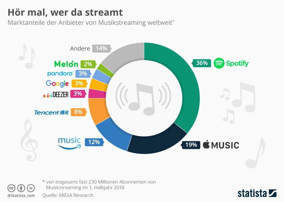 Wie die Musikindustrie-Experten errechnet haben, ist die Zahl der Abonnenten von kostenpflichtigen Musik-Abos im ersten Halbjahr 2018 um 15 Prozent auf 230 Millionen gestiegen. Mit 83 Millionen Premium-Nutzern kam Spotify dabei auf einen Marktanteil von 36 Prozent – und ist damit weltweiter Marktführer. Auf den Rängen folgen die Angebote von Apple, Amazon und Tencent.