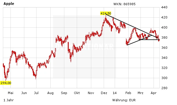 Nach einer Kursrallye konsolidierte die Apple-Aktie seit 5. Dezember 2013 in Form eines Dreiecks. Am 24. März gelang zunächst ein Ausbruch nach oben, welcher sich jedoch als Fehlausbruch entpuppte. Die Aktie befindet sich momentan an einer wichtigen horizontalen Unterstützungszone bei 375 Euro. Sollte diese Marke nach unten durchbrochen werden, so ist mit weiterem Abgabebruck zu rechnen. Kursziele wären in diesem Fall zunächst 365 Euro und später 352 Euro.