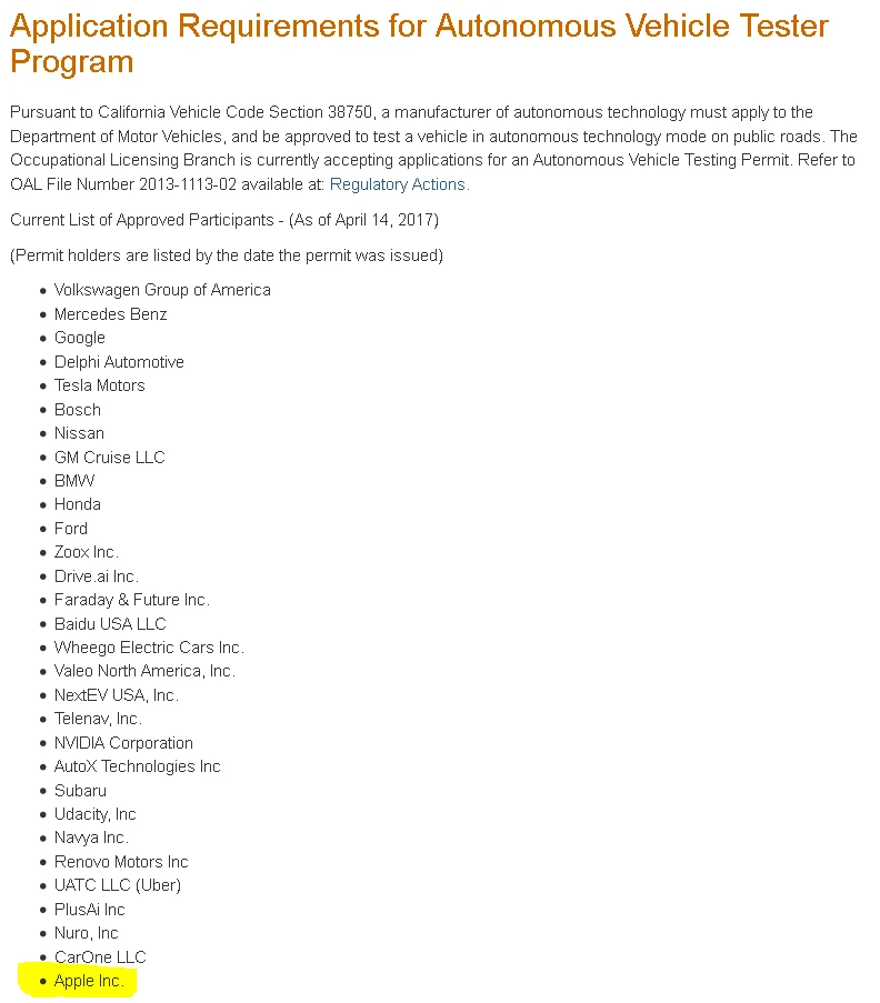 Auf der Liste der genehmigten Unternehmen vom kalifornischen Department of Motor Vehicles reiht sich Apple nun auf Platz 30 ein. Wie stark Apple im Zukunftsmarkt des selbstfahrenden Autos Fuß fassen möchte, bleibt nach wie vor offen.