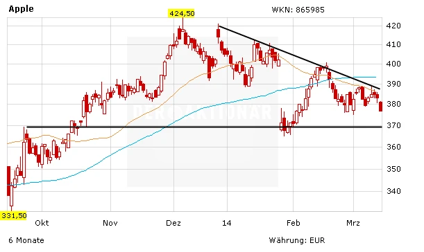 Noch ist die Gegenbewegung nicht vorbei. Doch der Schwung lässt nach. Für Trader, die auf einen kurzfristig steigenden Apple-Kurs spekulieren, ist der Titel wieder nach dem Sprung über die 390-Euro-Marke interessant. Kurzfristig orientierte Anleger ziehen spätestens die Reißleine, wenn das Niveau 360 Euro unterschritten wird.