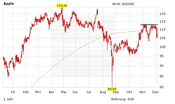 Zwar gehört der Apple Watch nach den Prognosen des IDC die Pole-Position im Smartwatch-Markt. Allerdings hatten zahlreiche Experten mit höheren Verkaufszahlen gerechnet. Sollte die Schätzung der Marktforscher zutreffen, generiert die Apple Watch gerade einmal 1,5 Prozent an den Gesamtumsätzen der Kalifornier. Dennoch: Apple ist finanziell sehr stark aufgestellt. Die iPhone-Umsätze wachsen stark, weshalb die Erlöse weiter steigen werden. Kurzfristig ist der Chart allerdings angeschlagen. Der Widerstand bei 120 Dollar erwies sich als zu stark. Investierte Anleger bleiben aufgrund der starken Aussichten dabei. Neue Positionen sollten aufgrund der Charttechnik momentan nicht aufgebaut werden.