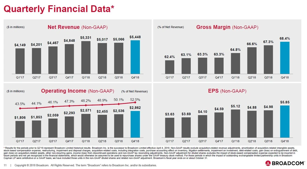 Der Chip-Hersteller Broadcom hat am Abend die Zahlen für sein viertes Quartal präsentiert, die besser als erwartet ausgefallen sind. Für Apple ist das insofern relevant, da Broadcom für Smartphonhersteller zum Beispiel Module für WLAN, Bluetooth, LTE oder Wireless Charging liefert. Auch für Apple. Die Zahlen von Broadcom sind im Gegensatz zu den meisten anderen Chip-Firmen sehr gut ausgefallen und lagen deutlich über den Erwartungen. Nachfolgend die Broadcom-Zahlen im Überblick: