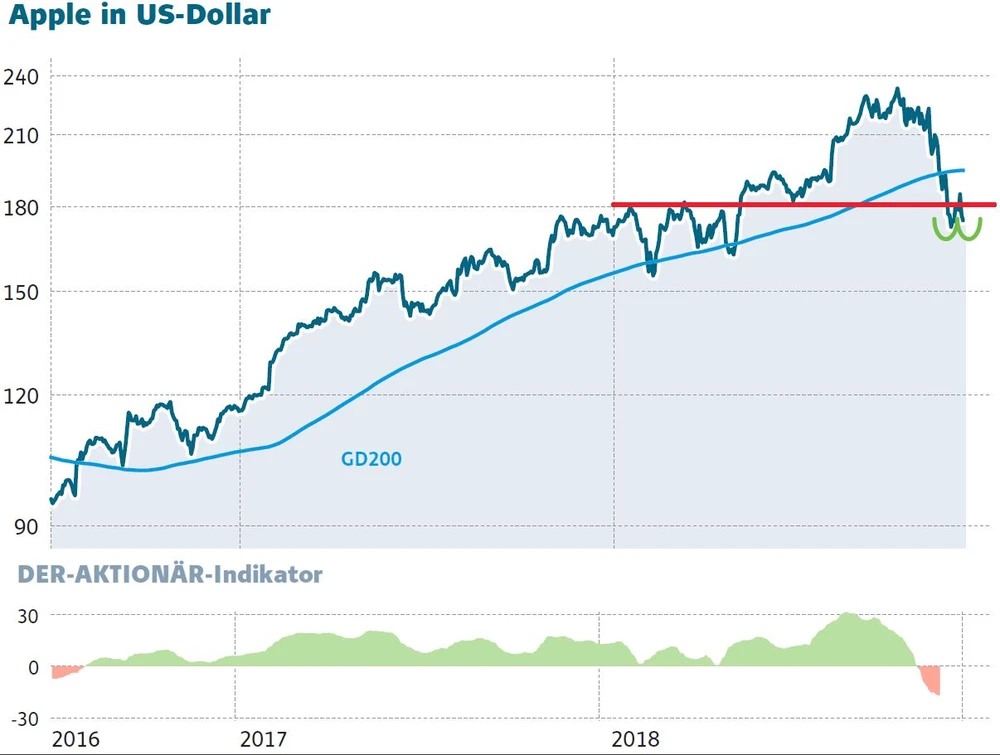 Unter dem Strich bestätigten die Zahlen, dass das Geschäft bei Apple nicht ganz so schlecht laufen kann, wie es derzeit von sämtlichen Seiten erwartet wird. Das gibt Apple reichlich Raum, bei der nächsten Zahlenvorlage positiv zu überraschen. Die positive Einschätzung des AKTIONÄR bleibt unverändert. Charttechnisch deutet sich ein Doppelboden an. Um ein erstes Kaufsignal zu generieren, muss die Aktie allerdings erst wieder den Widerstand bei 180 Dollar knacken.