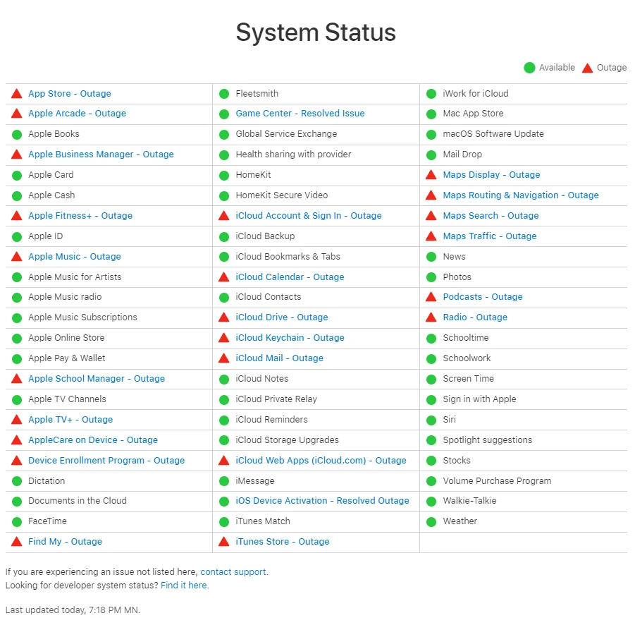 Das Störungsportal downdetector.com und dessen deutschsprachiger Ableger allestörungen.com zeigen ab etwa 17.20 Uhr deutscher Zeit einen starken Anstieg der Meldungen zu diversen Apple-Diensten. Auch Systemstatus-Website vom Apple selbst soll zeitweise offline gewesen sein, listet inzwischen aber sämtliche Dienste auf, die von der aktuellen Störung betroffen sind. Neben den Abo-Diensten seien dies insbesondere auch Cloud-Angebote und die Navigations-App „Karten“.