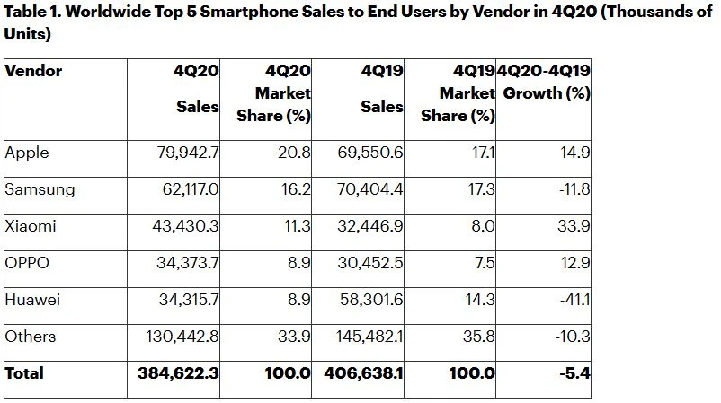 Die Top-Position im vierten Quartal hat Apple ganz klar dem Release des iPhone 12 im November zu verdanken. Auf Jahresbasis bleibt Samsung, die ein Viertel mehr Smartphones an den Mann brachten als Apple, klar vorne.