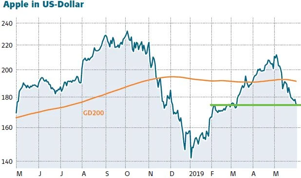 Die Aktie von Apple ist nach der jüngten Korrektur und dem Rutsch unter die 200-Tage-Linie charttechnisch angeschlagen. Langsam könnten sich allerdings antizyklische Einstiegschancen ergeben. Derzeit notiert das Papier im Bereich von 175 Dollar und damit einer ersten wichtigen Unterstützung. Im derzeitigen Umfeld ist die Aktie aber nur etwas für risikobewusste Trader.
