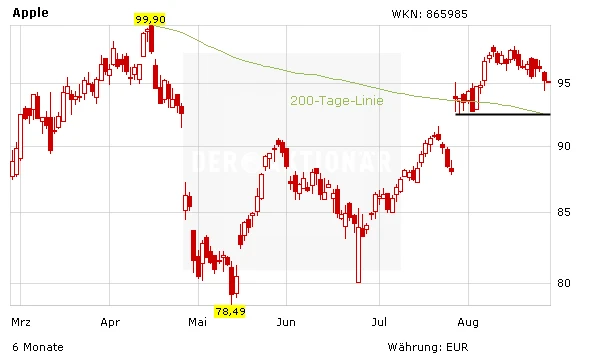 Ausgerechnet trifft es die Smartphones von Apple. Der Konzern aus Cupertino investiert seit Jahren viel Geld in die neusten Sicherheitsmechanismen und Verschlüsselungsdienste. Die Papiere von Apple verlieren um 0,4% auf 107,57 Dollar. Charttechnisch bleibt die Lage interessant: Nach der Aufwärtsbewegung steht ein Test der 200-Tage-Linie an. Investierte Anleger lassen ihre Gewinne laufen – Neueinsteiger warten einen erfolgreichen Test der Signallinie ab.