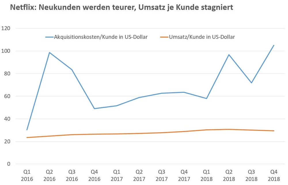 Netflix hat nicht nur beim Content hohe Kosten. Die Kundenakquise geht ebenso ins Geld. Im vierten Quartal schlug jeder Netto-Neukunde mit 105 Dollar Marketingkosten zu Buche. Das ist nur der globale Durchschnitt. In den USA, wo der Wettbewerb deutlich größer ist als auf der internationalen Bühne, musste Netflix 252 Dollar je Neukunden in Marketing investieren. Gleichzeitig liegt auf Quartalsbasis der Umsatz je Kunde gerade einmal bei 29 Dollar.