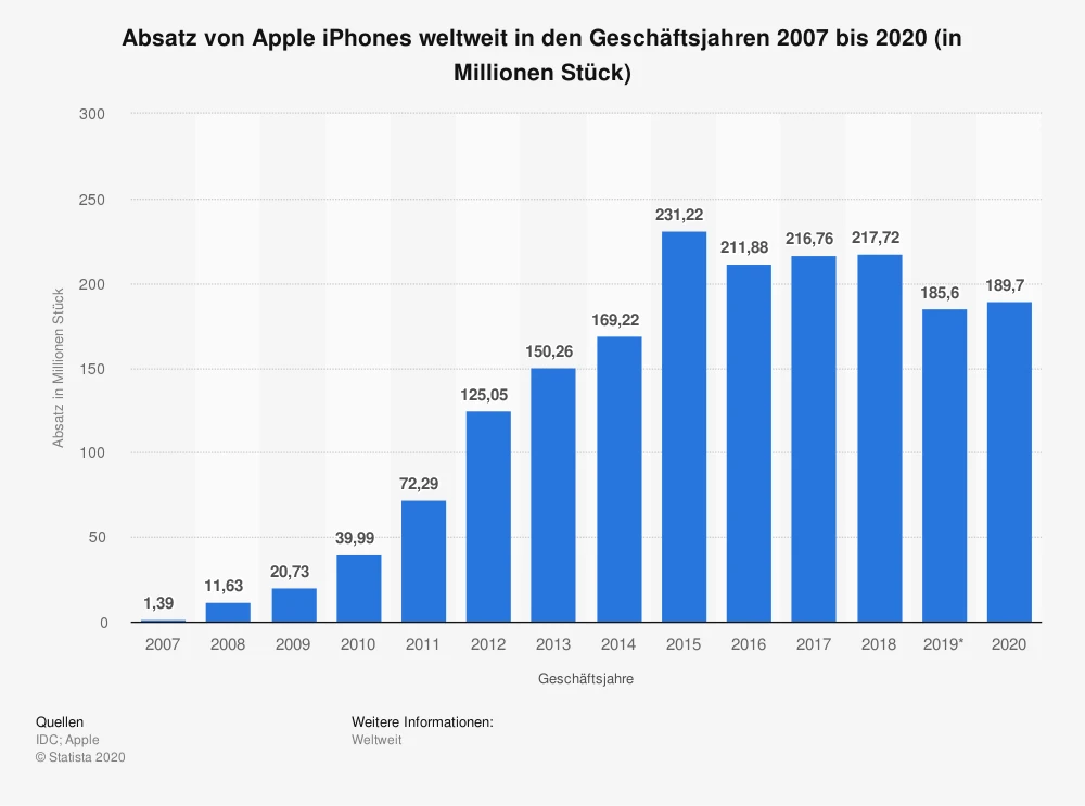Im Geschäftsjahr 2020 (bis Ende September) – also vor dem Verkaufsstart des iPhone 12 – hat Apple weltweit fast 190 Millionen Smartphones verkauft. Tendenz mit den brandneuen Geräten weiter deutlich steigend.
