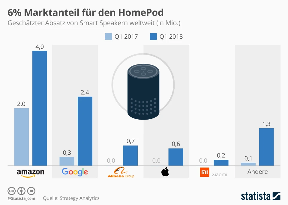 Kein leichter Einstieg für den HomePod von Apple. Neben den zwei Platzhirschen muss sich der iPhone-Hersteller die unteren Ränge mit Alibaba, Xiaomi sowie weiteren Herstellern smarter Lautsprecher teilen.