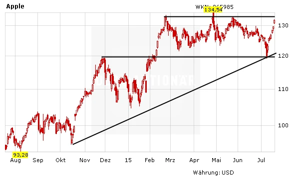 Nicht zuletzt aufgrund des Überraschungspotenzials, das Apple in der Vergangenheit immer wieder geliefert hat, dürfte die Bekanntgabe der Zahlen spannend werden, sondern auch aufgrund der charttechnischen Konstellation. Die Aktie verläuft schon seit Februar in einem engen Korridor von 120 bis 130 Dollar.
