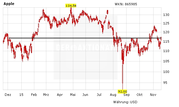 Auch wenn CEO Tim Cook mit weiterhin starken iPhone-Verkäufen rechnet: Eine Diversifizierung weg vom iPhone ist für die weitere Entwicklung Apples essentiell. Sollte sich Apple hin zum Dienstleister wandeln, würde das die Umsätze deutlich nach oben hieven. Aktuell generieren Service-Angebote weniger als zehn Prozent der Gesamtumsätze. Charttechnisch wird es für die Apple-Aktie in den nächsten Tagen spannend. Sollte die 200-Tage-Linie, die momentan bei 122 Dollar verläuft, überwunden werden können, würde das ein Kaufsignal generieren. DER AKTIONÄR sieht für das Papier ähnlich großes Potenzial wie Goldman. Das Kursziel liegt bei 145 Euro (155 Dollar). Der Stoppkurs sollte bei 91,50 Euro (98 Dollar) platziert werden.