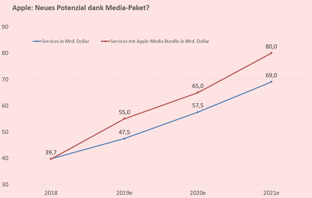 Bei Variante a) als reinen und quantitativ wohl überschaubaren Streaming-Dienst dürften die monatlichen Abo-Preise unter acht Euro/Dollar liegen. Im Bundle aus Apple Music, Texture und Video sieht das Ganze schon anders aus. In dieser Konstellation sollten Preise um 13 Euro/Dollar umsetzbar sein. DER AKTIONÄR geht sogar davon aus, dass diese Variante für die meisten Apple-User die attraktivere Wahl sein wird. Das Potenzial ist riesig. Man kann davon ausgehen, dass es rund eine Milliarde unique Apple-Kunden gibt. Entsprechend vielversprechend sind die Perspektiven, die der neue Service für die gesamte Service-Sparte bringt. Das Wachstum der Service-Sparte insgesamt dürfte durch das Media-Bundling deutlich höher ausfallen.