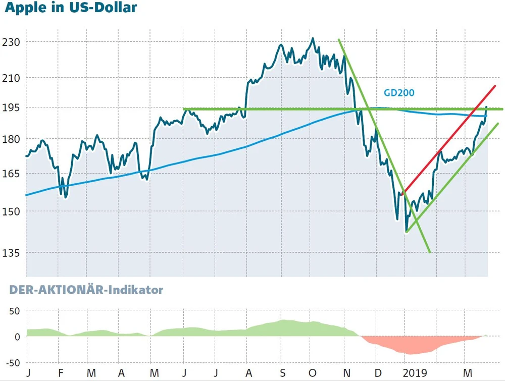 Die Fantasie für den neuen Service hat die Apple-Aktie zuletzt massiv beflügelt. Der Wert konnte sogar seinen GD200 überspringen und damit ein neues Kaufsignal generieren. Damit könnte sich der steile kurzfristige Aufwärtstrend technisch betrachtet durchaus fortsetzen. Angesichts der Tatsache, dass die Aktie kurzfristig überhitzt erscheint, muss allerdings am Montag eine überzeugende Präsentation der neuen Service-Perspektiven kommten. Dann ist mittelfristig sogar eine Rückkehr zum alten Hoch denkbar. Allerdings wäre es nicht das erste mal, dass Anleger im Anschluss an eine lange erwartete Apple-Präsentation Gewinne mitnehmen. Ein Neueinstieg ist daher nur bei schwächeren Notierungen ein Muss.