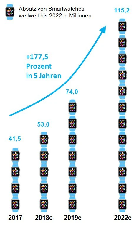 Bei Smartwatches ist Apple unangefochtener Marktführer mit einem Marktanteil von zuletzt 45 Prozent. Die nächsten Verfolger sind Samsung und Fitbit. Insgesamt soll der Markt für Smartwatches von 53 Millionen ausgelieferten Einheiten auf 74 Millionen und dann bis 2022 auf 115 Millionen steigen. Gerade das Smartwatch-Geschäft ist für Apple durchaus strategisch wichtig, nachdem die Uhren von Apple – zum Beispiel mit der neuen EKG-Funktionalität - ein Baustein für künftige Services im Gesundheitsbereich darstellen werden. Der Gesundheitsmarkt ist alleine in den USA mehr als 3 Billionen Dollar groß.