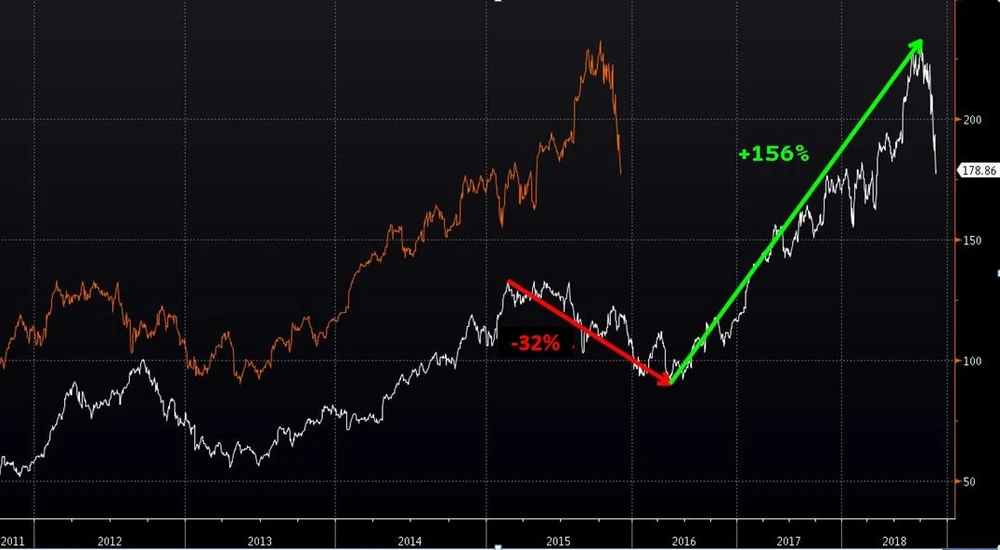 Die Frage ist allerdings: Wo könnte der Boden sein? DER AKTIONÄR hat das Kursverhalten von damals, also vor und nach dem Zwischenhoch im Jahr 2015, als die ersten Zweifel am iPhone-Absatz aufkamen, mit der jetzigen Situation verglichen. Dazu hat DER AKTIONÄR einfach die Zeitachse verschoben und die beiden Chart-Zeiträume übereinandergelegt (Orange ist dabei der aktuelle 4-Jahreszeitraum um drei Jahre nach links verschoben).